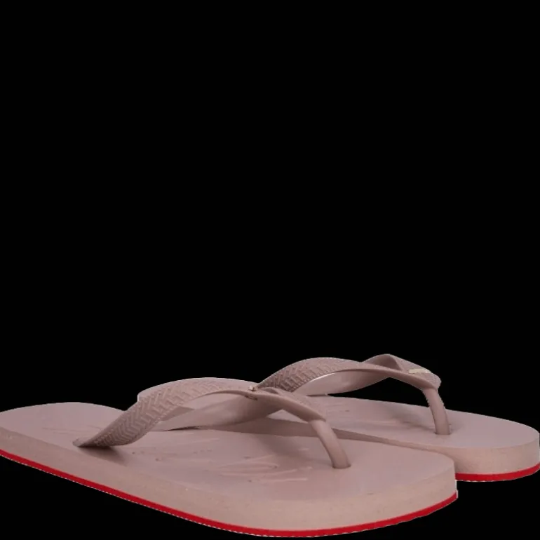 Klip klap, udført i brun gummi med rund snude. En klip klap er et sommer fodtøj og er dekoreret med de klassiske plastik stropper som holder foden fast.