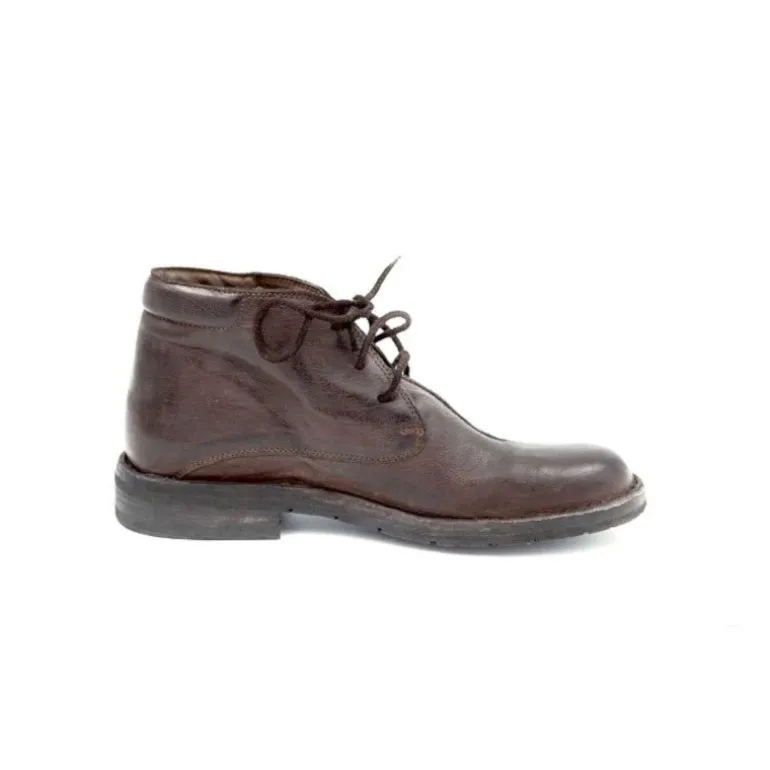 Lækker, kort snørestøvle i en flot hasselnød farve lavet i blødt, vasket, vegetabilsk garvet skind med gummisåler. Støvlen bindes med en vasket machende skindssnøre.