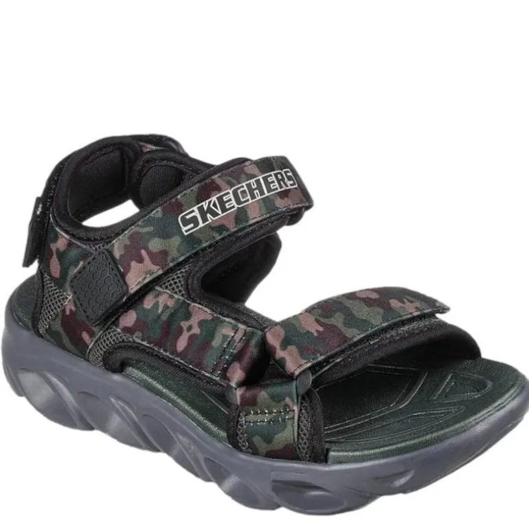 Sjov og solrige dage med Skechers¸ S Lights¸: Hypno-Splash – Sun Breaks. Denne sporty sandal har camouflage printet tekstil overdel med velcrolukninger og lys i mellemsålen