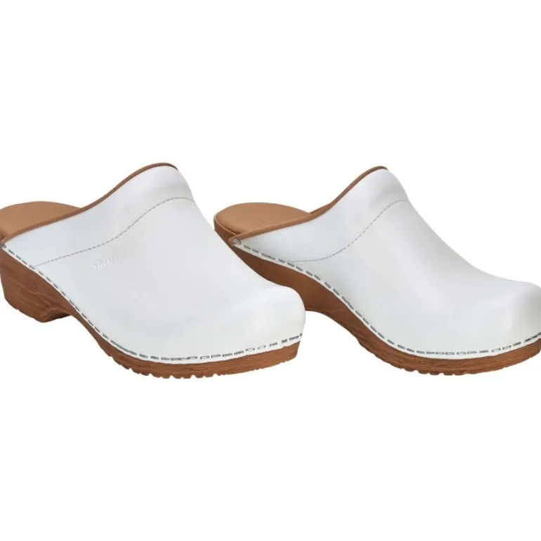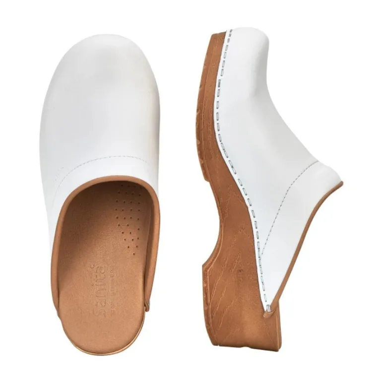 Fin hvid tøffel træsko, som er lavet i markedets bedste kvalitet. Denne træsko er lavet i PU læder, hvilket gør træskoen nem at rengøre.