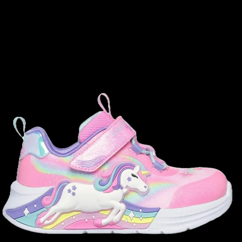 Glimtende og skinnende stil med Skechers S-Lights: Unicorn Chaser. Denne sporty sko med lysende design har en overdel med syntetisk glimmerfinish og en enhjørning- og regnbuegrafik på siden. Børneskoene har elastiske snørebånd, justerbar rem over vristen og en polstret komfort indersål. Fang dit barns fantasi med disse magiske og behagelige sko, perfekt til både leg og eventyr. Dit barn får en bonusgave med købet.