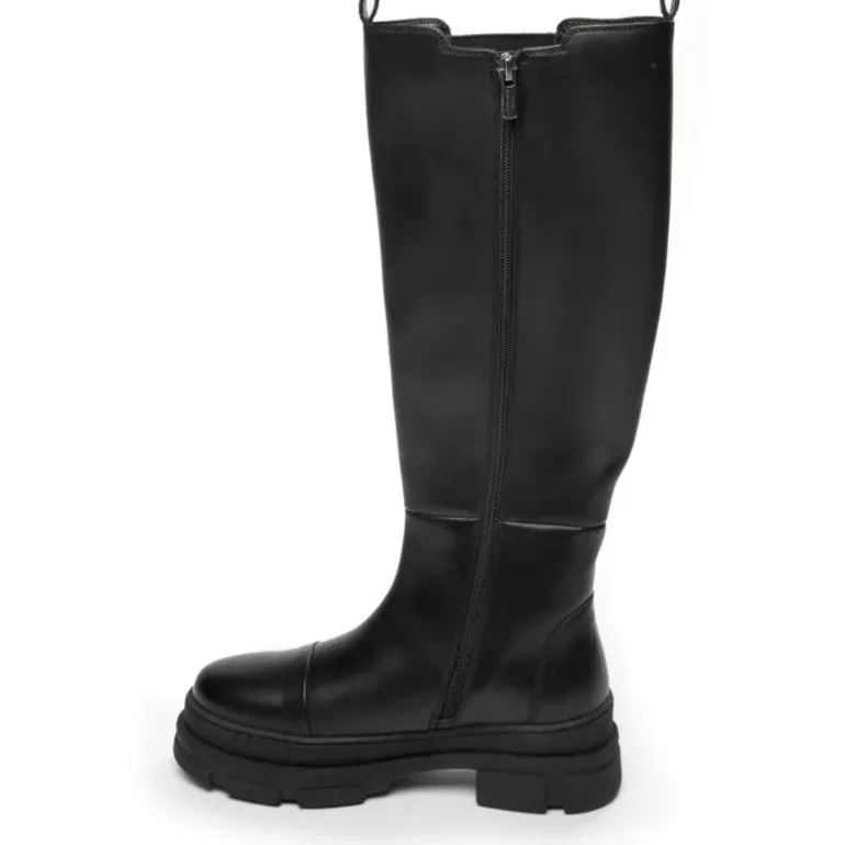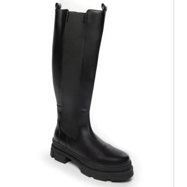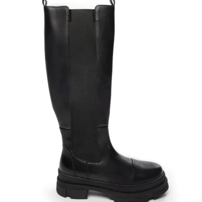 Lange støvler i læder. Elastik på ydersiden og lynlås på indersiden af skaftet og chunky såler.