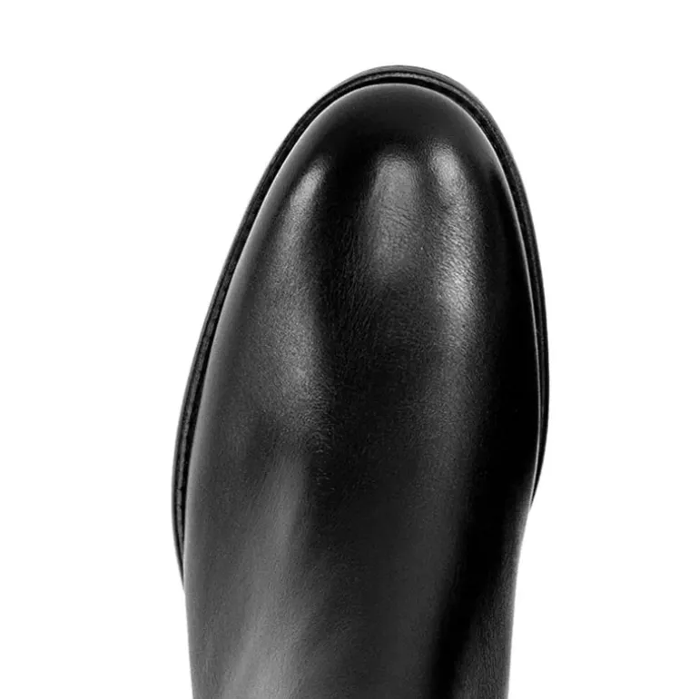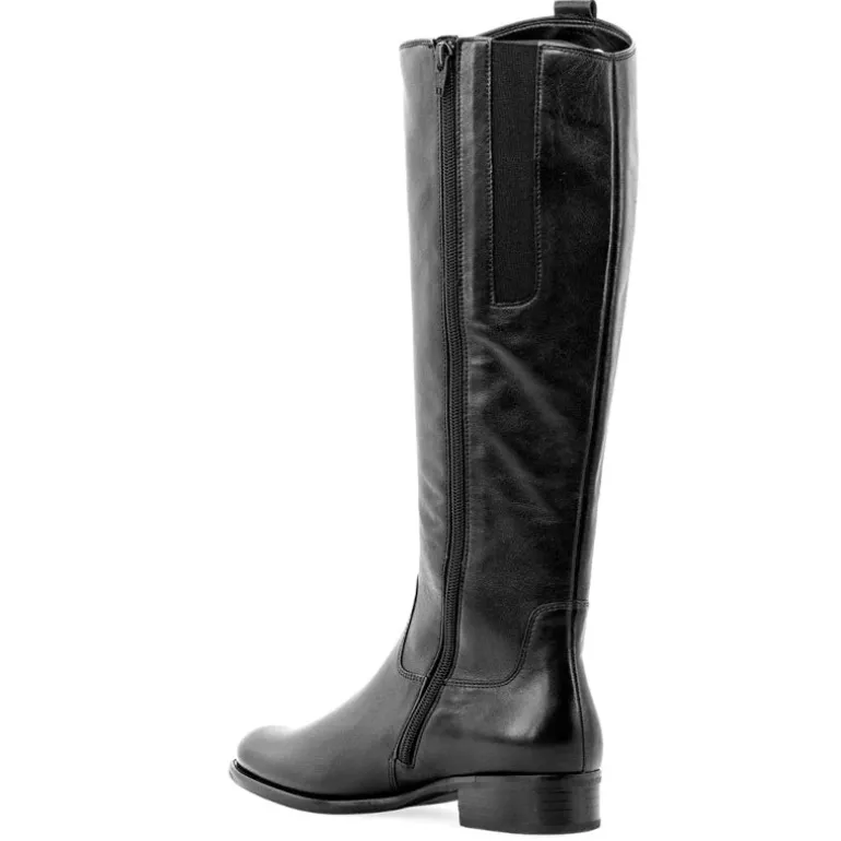 Klassisk lang sort skind støvle med lynlås og elastik kile på indersiden.Skaftvidde S – Microfiber foer . Optifit udtagelig indlægssål. Skafthøjde 42 cm og hælhøjde 3 cm. Normal F