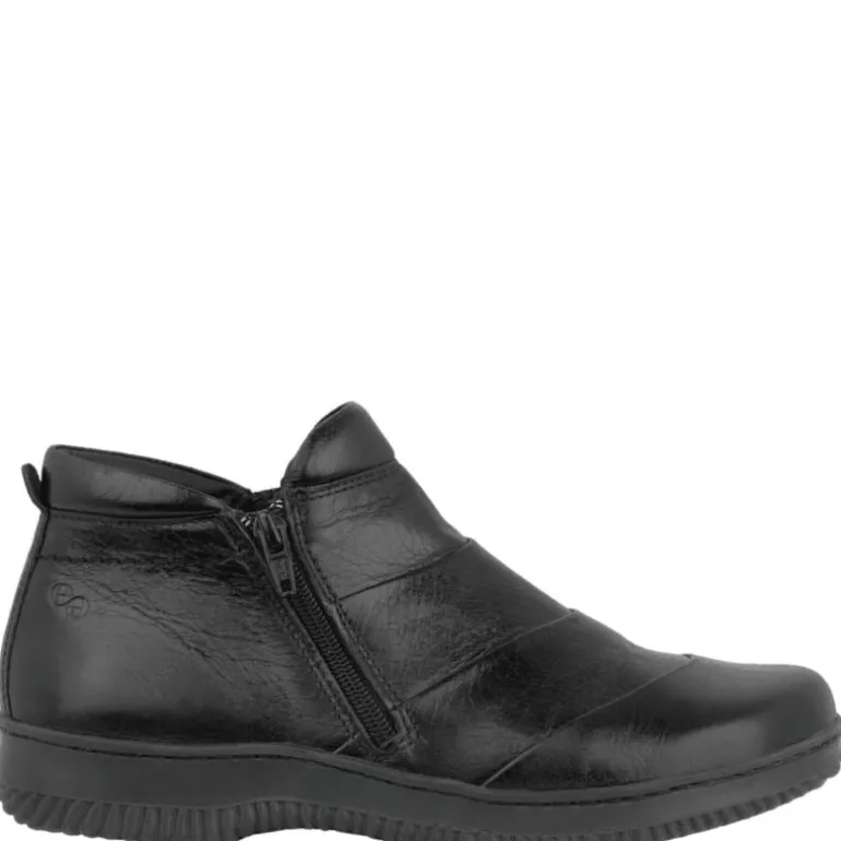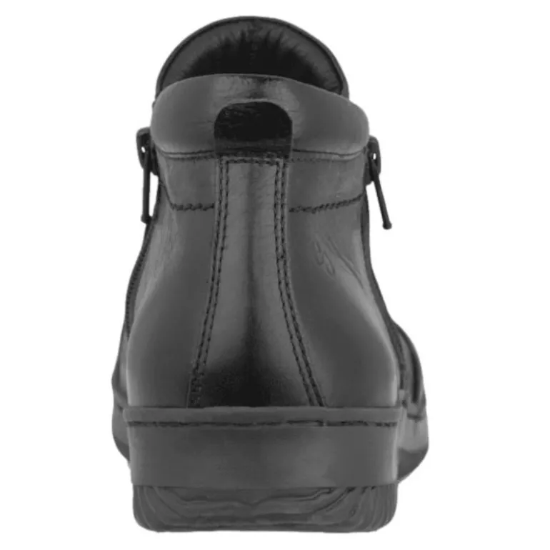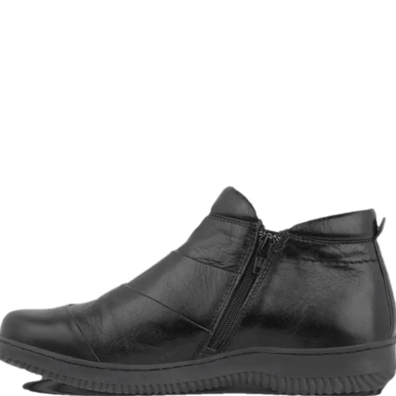 Superkomfortabel, kort støvle i læder med dobbelt lynlås og smarte syninger, der giver et helt særligt look. Lynlåsene gør samtidig støvlen let at få af og på, om med den mønstrede gummisål, er du også sikker på et godt vejgreb.
