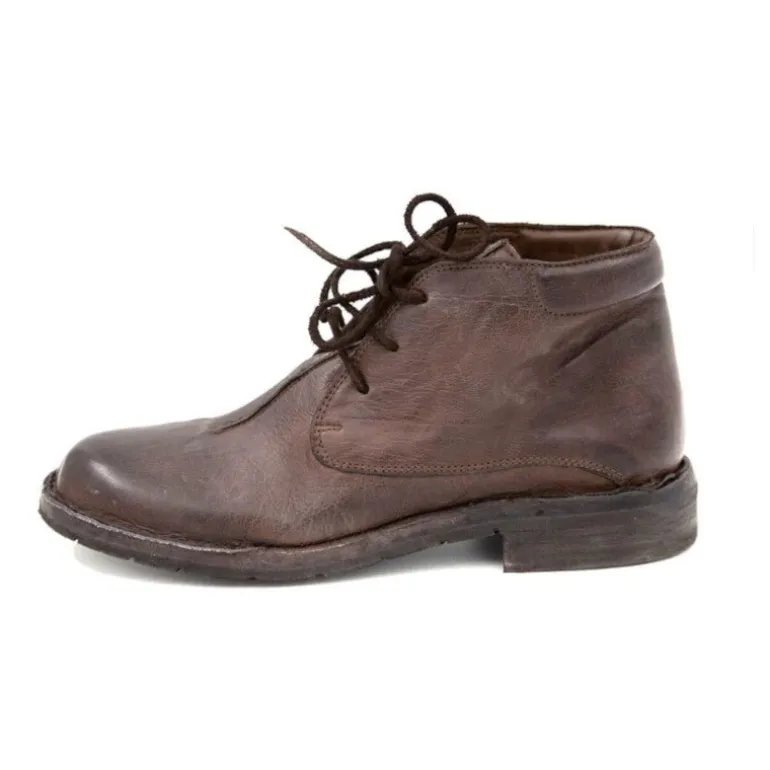 Lækker, kort snørestøvle i en flot hasselnød farve lavet i blødt, vasket, vegetabilsk garvet skind med gummisåler. Støvlen bindes med en vasket machende skindssnøre.